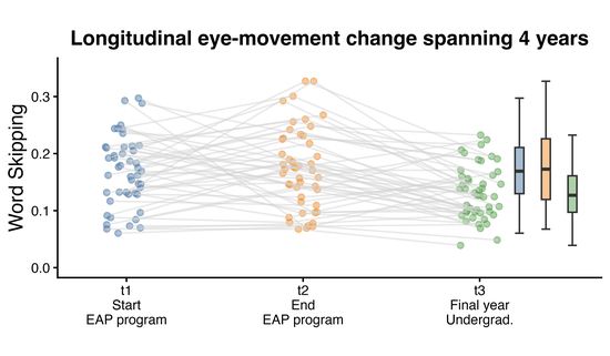 How does English reading development unfold after a bridging (EAP) program ends? We followed the same international students across ~4 years and used eye-tracking to watch L2 reading development unfold in real time. We asked: Which skills grow fastest during the EAP program, and which changes persist (or shift) once students move into undergraduate study? The figure shows one example—word skipping—across three timepoints. This project was published in Reading and Writing.
