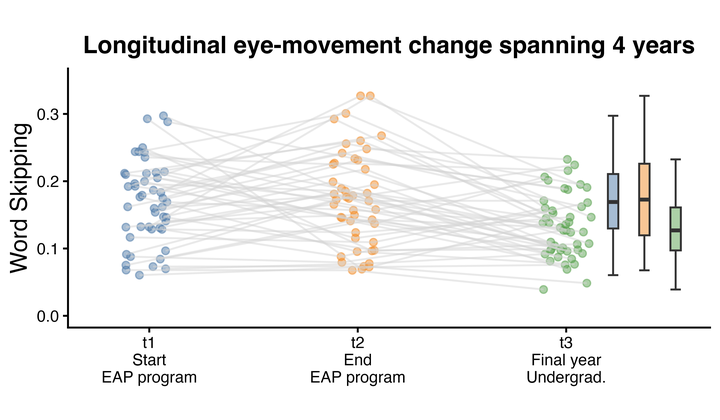 Reading development doesn’t stop when an English bridging program ends. We tracked the same students from the start of EAP (t1) to the end of EAP (t2) and again in the final year of undergrad (t3) to see how reading fluency and reading behavior evolve over time—using eye movements as a real-time window into reading.
